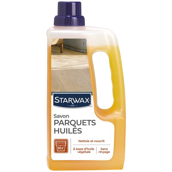 Le savon d'entretien pour parquet huilé de 1 L de la marque STARWAX est idéal pour éliminer les taches et les salissures courantes. Il préserve l'aspect naturel des parquets huilés. Produit 2 en 1 spécial parquets huilés et cirés. Respecte et nourrit le bois. Formule riche en huiles naturelles : savon d'origine végétale. Formule sans rinçage et non glissant. S'utilise régulièrement : environ 1 à 2 fois par semaine (jusqu'à 50 nettoyages). Produit fabriqué en France.
