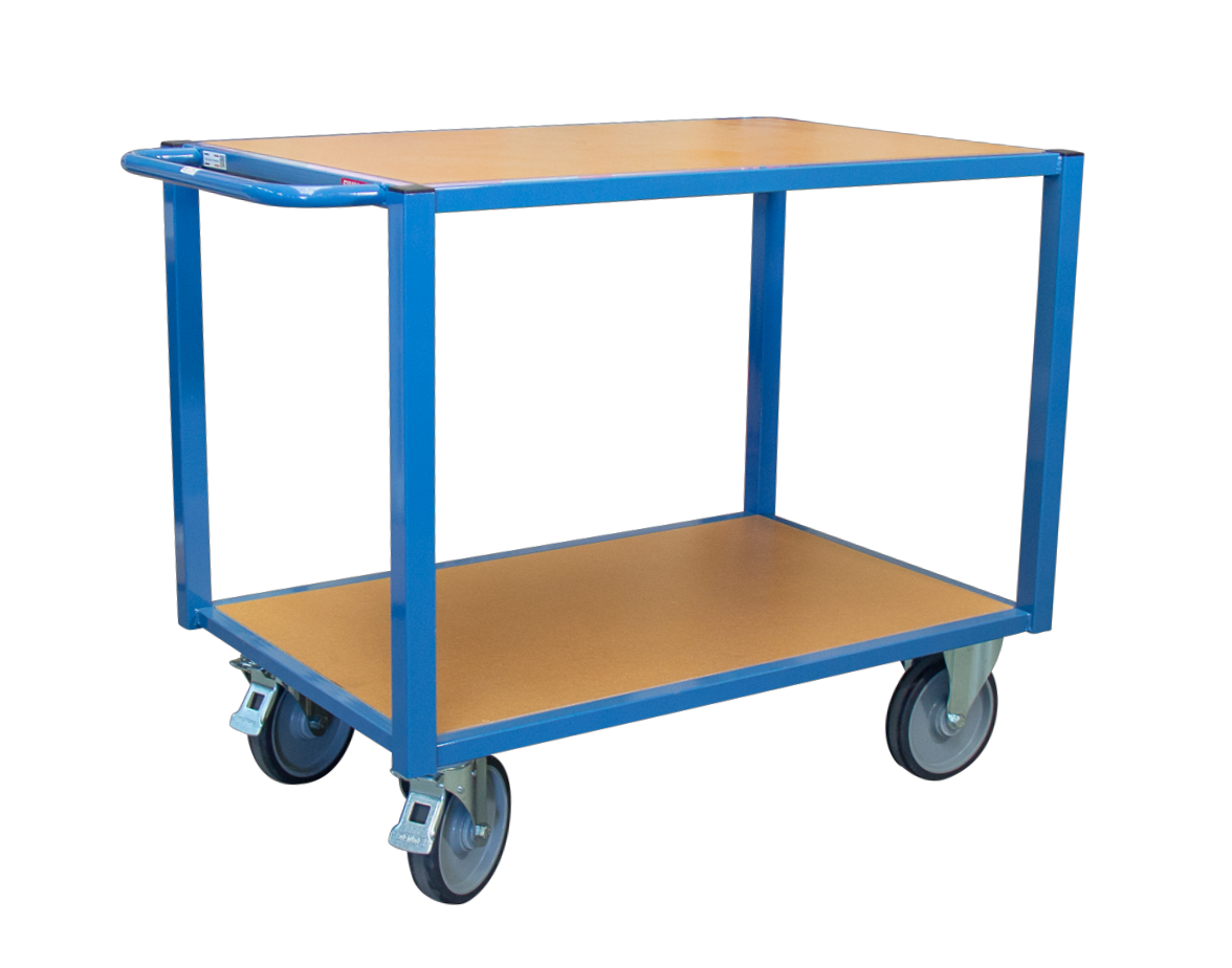 Châssis conçu pour des utilisations intensives entièrement mécano-soudé en tube de section rectangulaire 40 × 40 mm avec renforts sous plateaux. Plateaux en bois médium d’épaisseur 16 mm. Très résistants aux chocs répétés, ils ne se fendent pas, n’éclatent pas et sont encastrés dans le châssis pour une meilleure protection contre les chocs. Poignée en tube Ø 28 mm permettant une bonne prise en main. Hauteur ergonomique. 2 roues fixes + 2 roues pivotantes à frein norme EN 1757. Roues montées sur roulement à billes à bandage TPE, non tachantes, silencieuses, effort au démarrage réduit de 50 %.