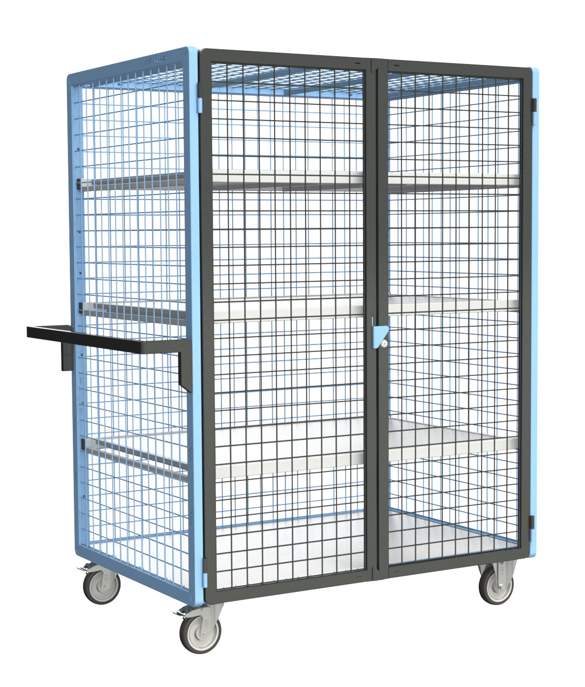 Châssis conçu pour des utilisations intensives entièrement mécano-soudé en tube rectangulaire de section 35 × 20 mm avec renforts sous plateaux. Poignée à hauteur ergonomique, en tube 35 × 20 mm pour une bonne prise en main. Panneaux grillagés en maille de 50 × 50 mm offrant une grande liberté de positionnement pour les étagères incluses. Charge utile par étagère 100 kg. Plateau de la base inclus. Hauteur utile de 1460 mm. Verrouillable : fermeture par 3 points et poignée affleurante permettant d'éviter les accrochages, jeu de 2 clés fourni. 2 roues fixes + 2 roues pivotantes à frein sur roulement à billes, norme EN 1757. Roues à bandage TPE non tachantes, silencieuses, effort au démarrage réduit de 50 %. Produit livré prêt à l'emploi : un gain de temps pour les professionnels, sauf poignée à monter.
