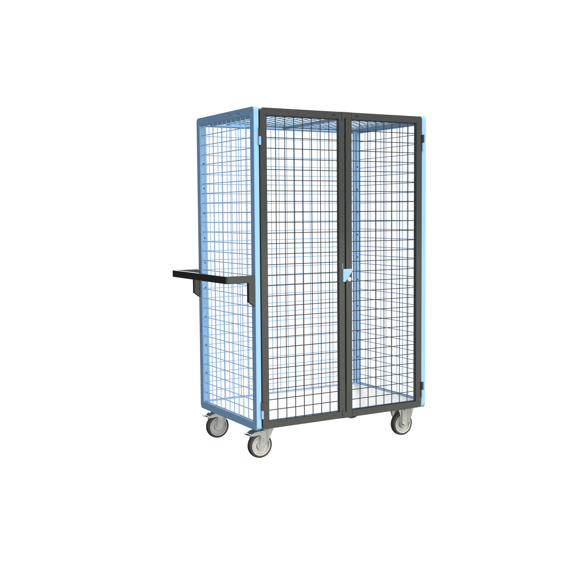 Châssis mécano-soudé conçu pour des utilisations intensives en tube de section 35 x 20 mm avec renforts sous plateau. Plateau encastré. Poignée à hauteur ergonomique, en tube de 35 x 20 mm pour une bonne prise en main. Panneaux et toit grillagés en maille de 50 × 50 mm offrant une grande liberté de positionnement pour les étagères en option, possibilité de rajouter jusqu’à 9 étagères. Plateau de la base inclus en bois mélaminé gris épaisseur 16 mm. 2 roues fixes + 2 roues pivotantes à frein norme EN 1757. Roues à bandage TPE montées sur roulement à bille étanche, non tâchantes, silencieuses avec un effort au démarrage réduit de 50 %. Livrée montée sauf poignée à fixer.