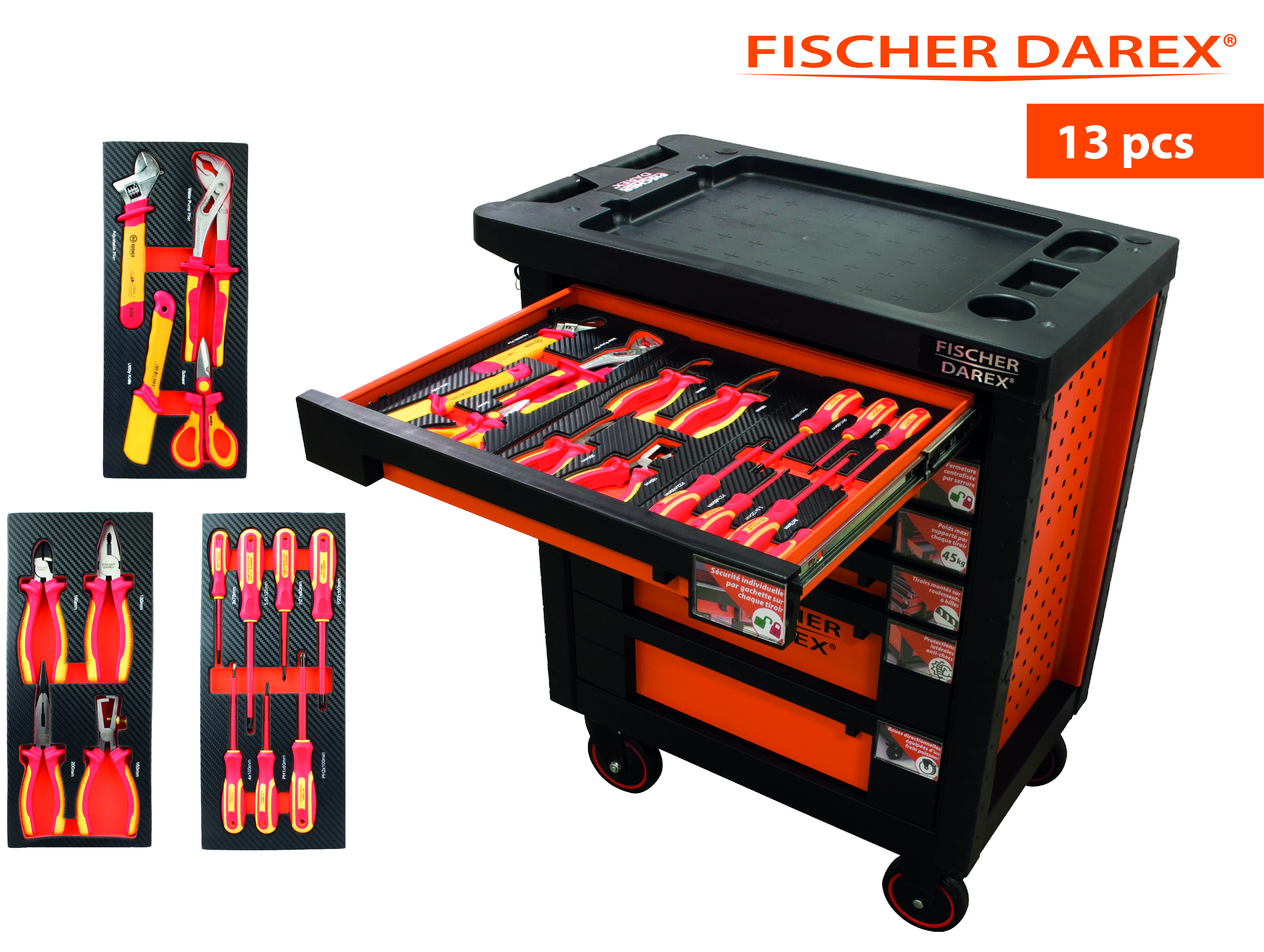 Elle est équipée de six tiroirs montés sur glissières à billes, sécurisés par une gâchette et munis de tapis de protection. Les quatre tiroirs supérieurs mesurent 53 x 40 x 5 cm, tandis que les deux inférieurs font 53 x 40 x 13 cm. Chaque tiroir supporte jusqu’à 45 kg, et la servante affiche une résistance statique de 700 kg.