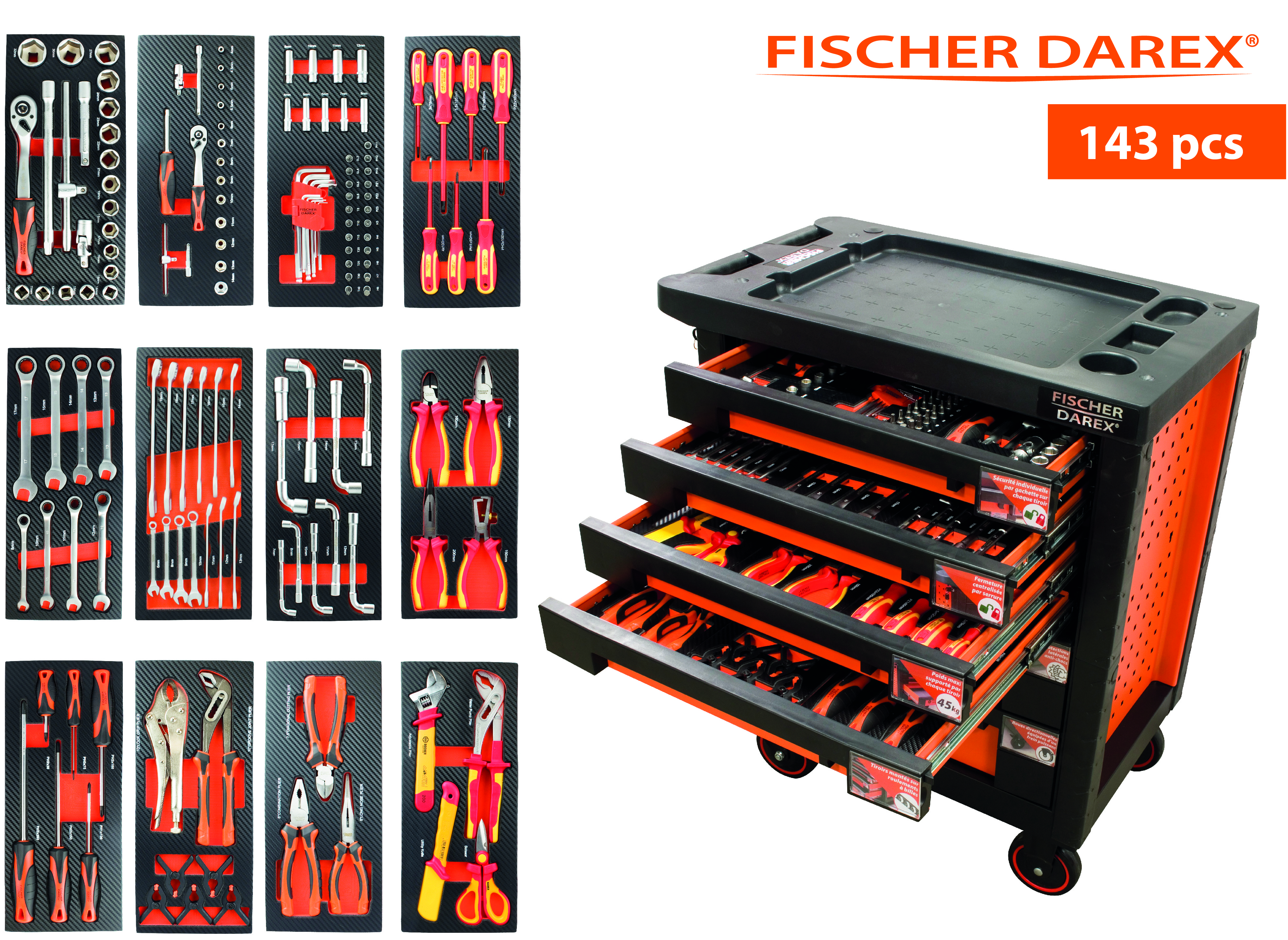Elle est équipée de six tiroirs montés sur glissières à billes, sécurisés par une gâchette et munis de tapis de protection. Les quatre tiroirs supérieurs mesurent 53 x 40 x 5 cm, tandis que les deux inférieurs font 53 x 40 x 13 cm. Chaque tiroir supporte jusqu’à 45 kg, et la servante affiche une résistance statique de 700 kg.