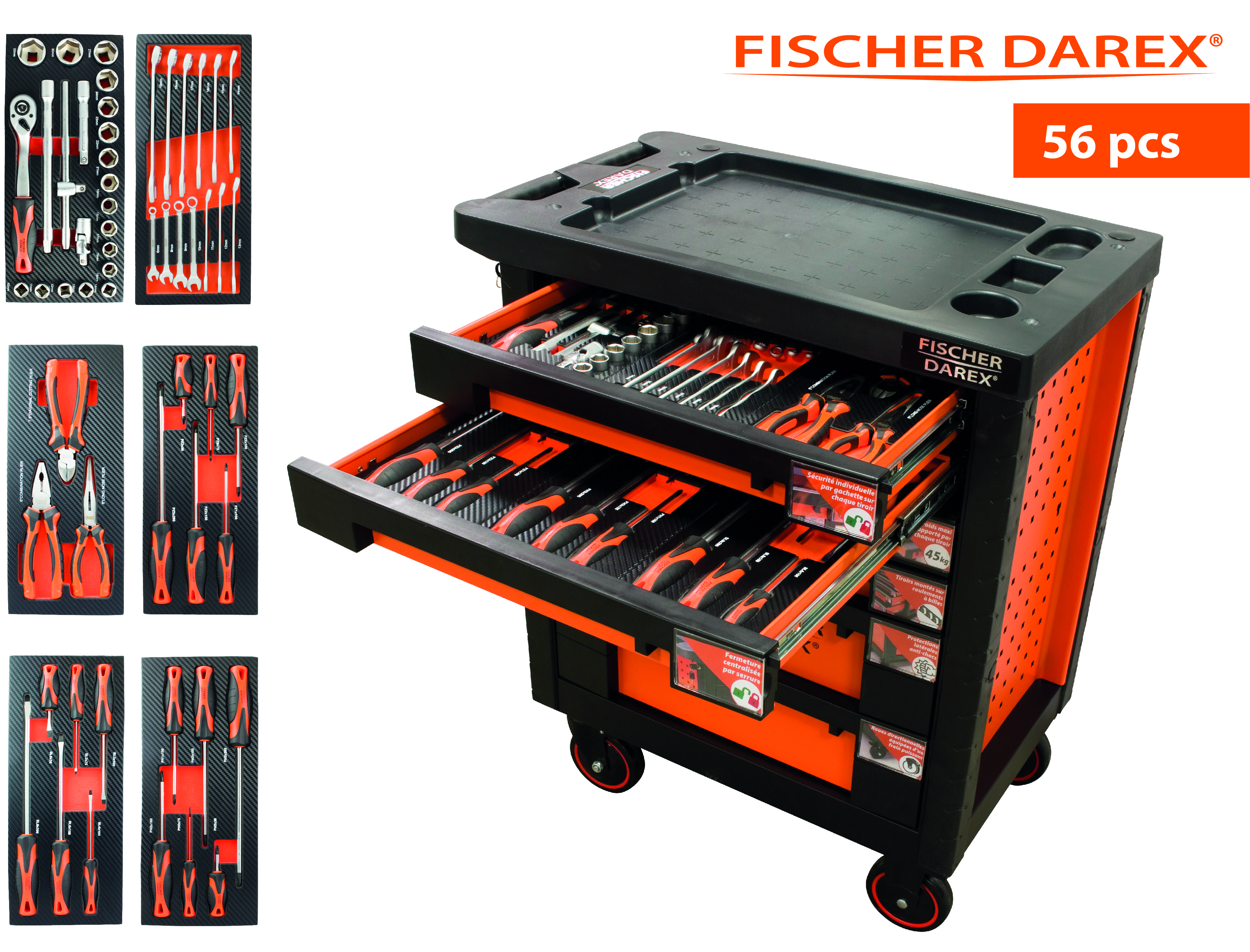 Elle est équipée de six tiroirs montés sur glissières à billes, sécurisés par une gâchette et munis de tapis de protection. Les quatre tiroirs supérieurs mesurent 53 x 40 x 5 cm, tandis que les deux inférieurs font 53 x 40 x 13 cm. Chaque tiroir supporte jusqu’à 45 kg, et la servante affiche une résistance statique de 700 kg.