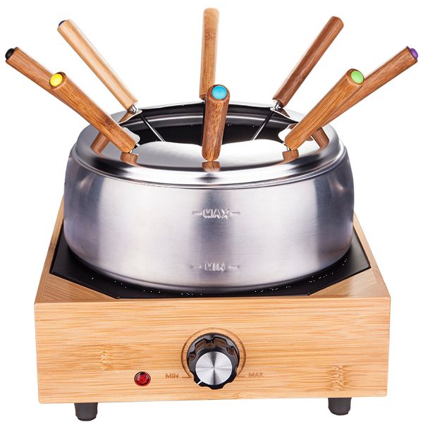 Service à fondue 8 personnes Bambou - Happy - Un appareil multifonction pour toutes vos fondues : fondues savoyardes, fondues bourguignonnes, fondues chinoises ou même fondues au chocolat ! - Caquelon XL en inox antiadhésif d'une grande capacité de 2 L - Couronne en inox avec encoches pour positionner les fourchettes lors de la cuisson - 8 fourchettes avec poignée en bambou avec bouton de couleurs différentes afin que chaque convive retrouve facilement sa fourchette - Thermostat réglable pour adapter la température de cuisson à chaque recette - Base chauffante élégante en bambou avec pieds antidérapants - Coloris Inox et Bois - Puissance 800 W - Dimensions 25 x 22 x 17.5 cm.