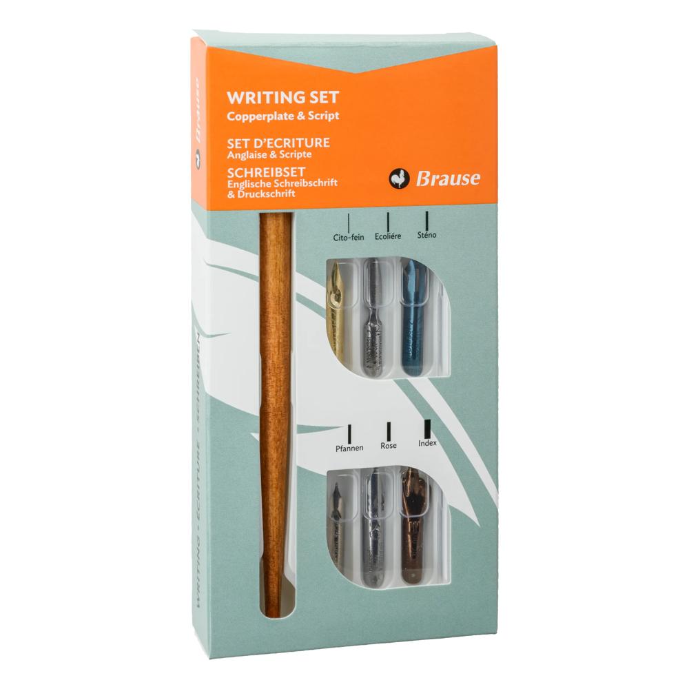 Un set pour s'initier à l'écriture à la plume. Ce set contient 6 plumes (361B/29B/65B/50B/76B/46B), 1 porte-plume en bois et 1 notice explicative. La plume Cito-fein est une plume traditionnelle pour l'anglaise et la scripte. L'Ecolière, plume fine et assez dure convient parfaitement pour l'écriture, le dessin et la calligraphie. La plume Sténo, aigüe et échancrée en acier bleui est idéale pour l'anglaise. La Pfannen et la rose sont en acier dur pour la scripte. La plume Index, simple et précise avec sa plume mi-fine a une grande réserve d'encre. Brause est le spécialiste depuis 1850 des plumes de calligraphie, de dessin et d'écriture. Fabrication allemande.