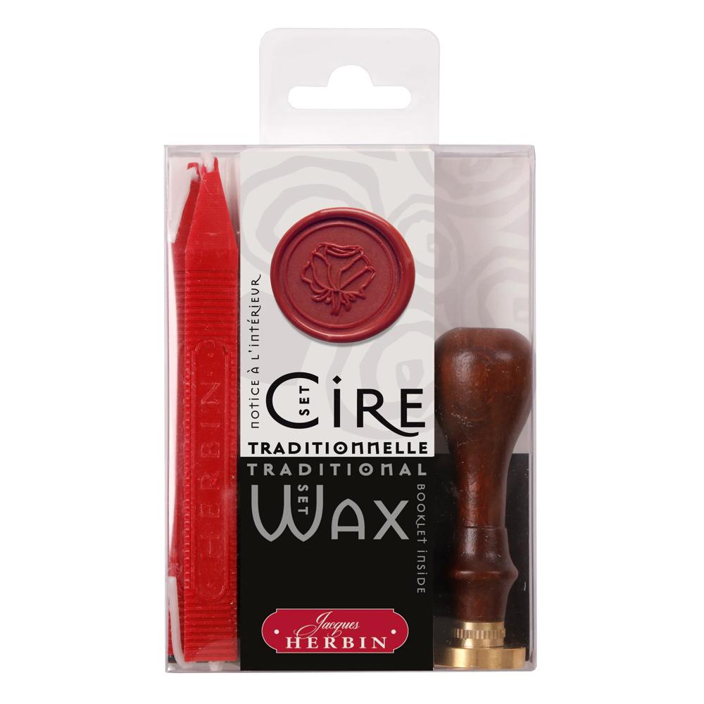 Un set idéal pour s'initier à la cire, comprenant: 2 bâtons de cire à mèche, 1 manche en bois, 1 sceau motif soleil 24 mm, 1 notice