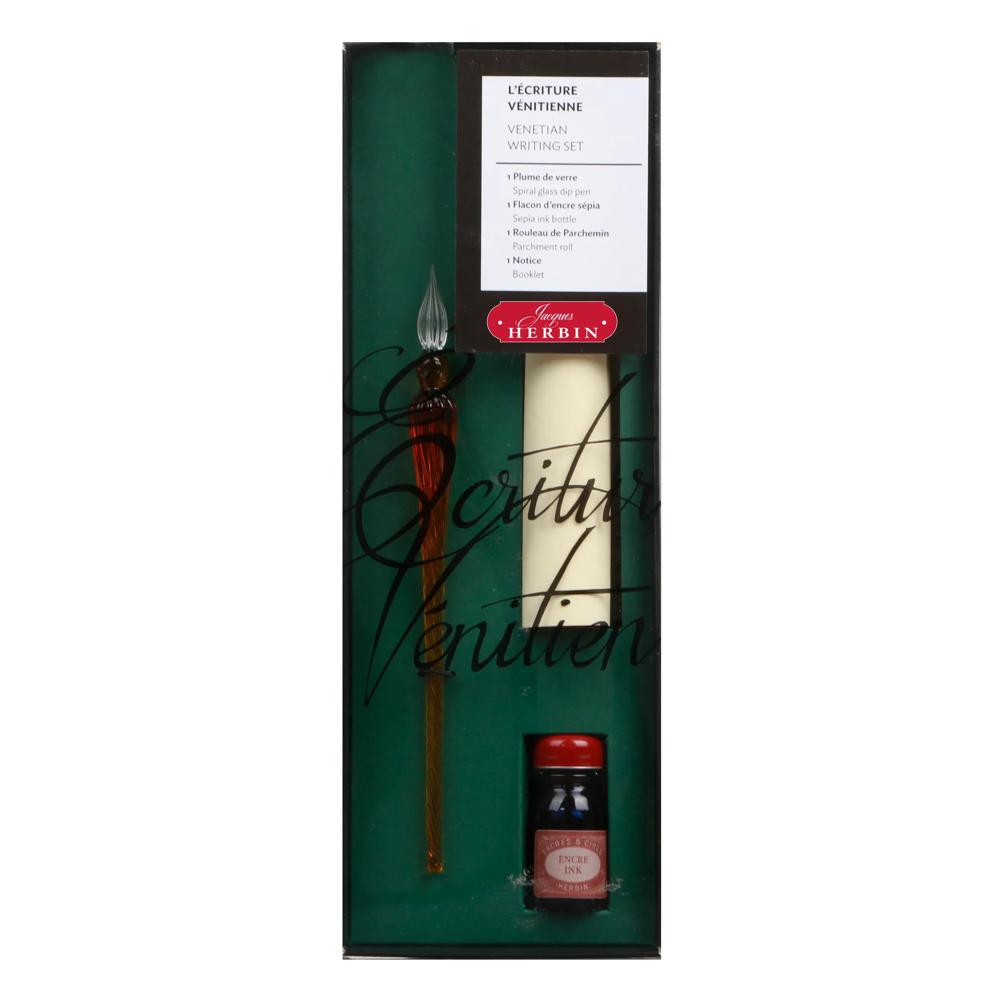 Set d'écriture comprenant: 1 grande plume de verre torsadée, 1 feuille de parchemin, 1 flacon d'encre sépia 10 ml et 1 notice avec un modèle d'alphabet. La plume de verre est un instrument très facile et agréable d'utilisation. Une manière de s'entraîner à écrire, comme les marchands vénitiens, avec une belle plume de verre ! Fabriqué en France.