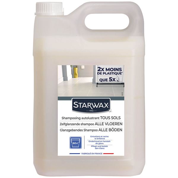 Le shampooing brillant 5 L de la marque STARWAX pour sols carrelés. Sapplique 1 à 2 fois par mois pour nettoyer et raviver la brillance en une seule opération. Renforce la brillance et leffet protecteur du Brillant longue durée. Sans rinçage. Pour tous types de carrelages (sauf contre-indication du fabricant). Convient aussi sur sols plastiques. Rendement : environ 400 m². Bien dépoussiérer le sol, diluer 1 à 2 bouchons de Shampooing par litre deau (1 seau de 3 L = 100 m² environ) et appliquer uniformément avec une serpillière propre et humide. Laisser sécher sans rincer.