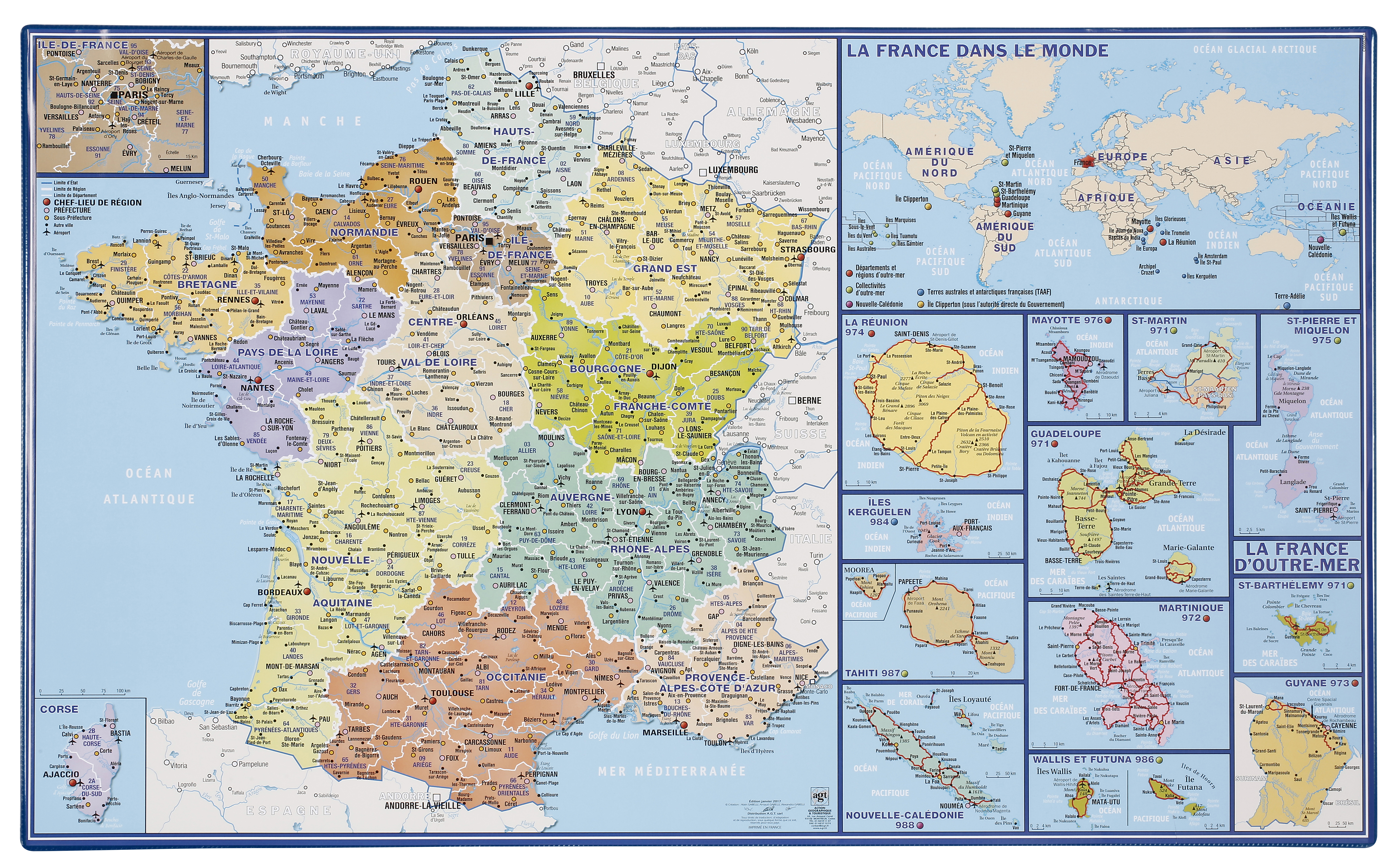Ce sous-main éducatif en français propose une carte de géographie de France et Dom-Tom en couleurs avec les nouvelles régions