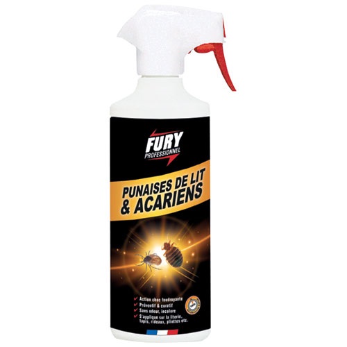 Le spray anti-punaises de lit et acariens en 500 ml de chez Fury est un insecticide. Action choc foudroyante, préventif & curatif, sans odeur, incolore. il s’applique sur la literie, tapis, rideaux, plinthes. Fury c'est une efficacité max, des solutions insecticides puissantes et techniques pour une action choc et durable. Fury tue punaise de lit et acariens. C'est un insecticide de surface qui agit par contact. Spécialement formulé pour éliminer rapidement tous les acariens, punaises de lit, larves responsables des allergies, asthmes, démangeaisons, infections cutanées et stoppe leur développement. Les micro-particules diffusées pénètrent dans les moindres recoins. S’utilise sur la literie, les matelas, oreillers, tapis, moquettes, canapés, plinthes, rideaux. Usage intérieur et extérieur. Agitez avant emploi. Fermez les portes et les fenêtres pour une utilisation en intérieur. Tournez l’embout sur la position ON. Pulvérisez à une distance de 20 cm directement sur la surface à traiter (literie, matelas, tapis, moquettes, canapé). Veillez à pulvériser de manière à bien couvrir la surface à traiter. Apparition de l’action Biocide dans les minutes suivant le contact avec le produit. Le produit reste efficace jusqu’à 6 mois (sans rinçage de la surface traitée). Pour éliminer l’action biocide, nettoyer les surfaces traitées à l’aide d’un détergent classique. Craint le gel.