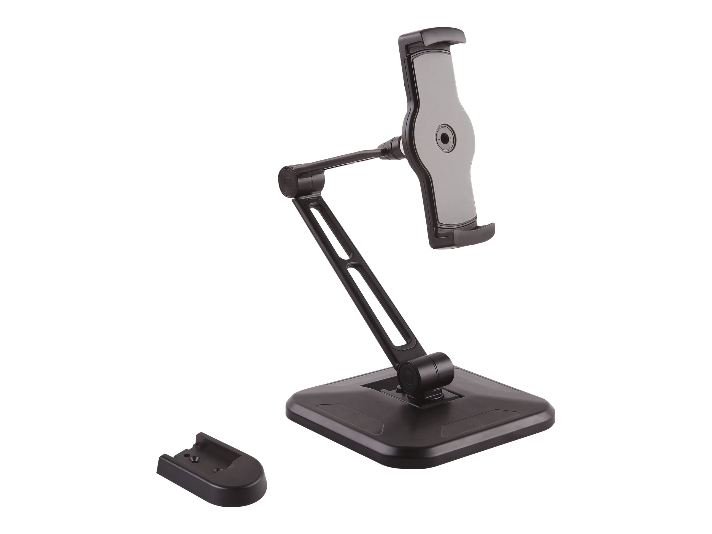 La pince de fixation s'installe facilement pour tenir une tablette ou un téléphone avec un format d'écran de 4.7" à 12.9" et pesant jusqu'à 1 kg. Grâce à sa large base, le support pour tablette s'installe en toute sécurité sur votre bureau, un comptoir ou toute autre surface plane. Une base plus petite, également incluse, permet d'installer le support pour tablette sur un mur ou sous une étagère ou un placard de cuisine, pour s'appliquer à de multiples scénarios.