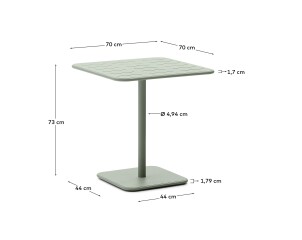 Table d’extérieur en acier galvanisé avec finition en couleur turquoise. La base renforcée par du ciment apporte une meilleure stabilité.