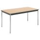 Plateau 140 x 70 cm, panneaux de particules mélaminés, épaisseur 19 mm, H 75 cm.Chants souples avec bordure antichoc PVC 3 mm.Superbe piétement rond Ø 32 mm, finition chromée. Vérins.