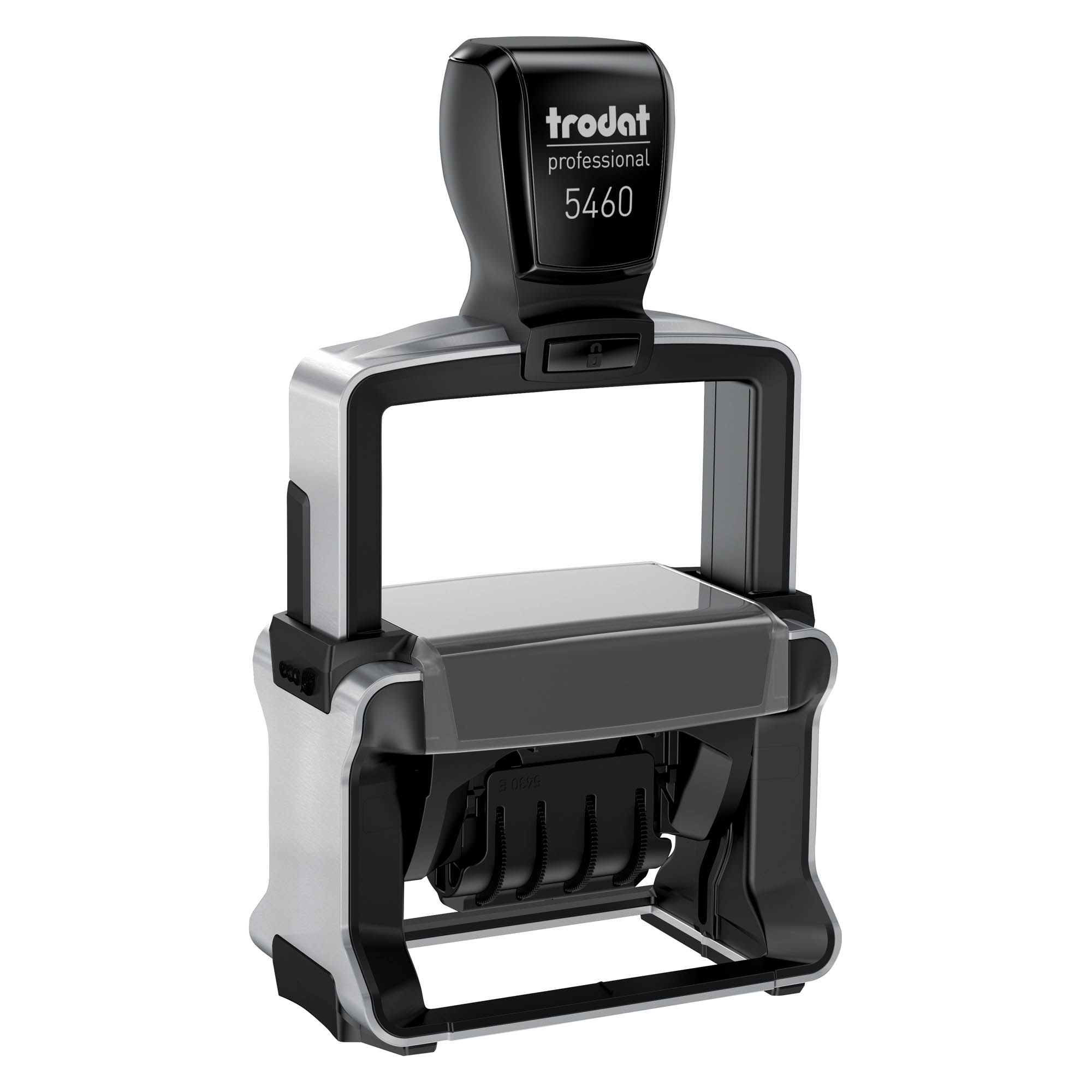 Plaque rectangulaire 56 x 33 mm - 3 + 3 lignes et date. Monture métal carénée plastique, encrage automatique avec plaque caoutchouc personnalisée.