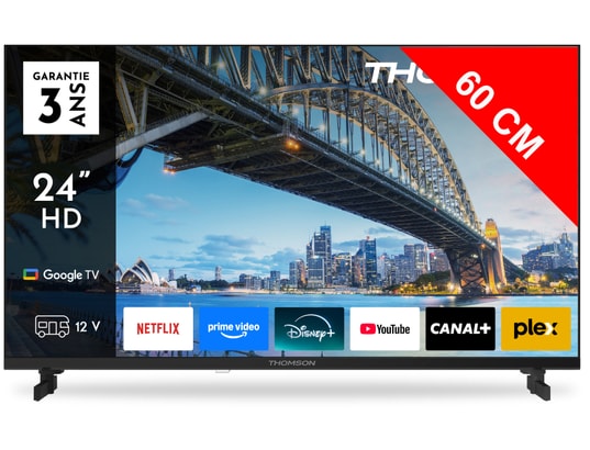 Le téléviseur Thomson 24HG2S15C est une Smart TV compacte de 24 pouces (60 cm) qui associe praticité, connectivité moderne et qualité d’image optimisée. Idéal pour une chambre, une cuisine, un bureau ou même un camping-car grâce à son adaptateur 12 Volts inclus, il vous suit partout sans compromis sur vos contenus. Avec sa résolution HD 1366 x 768 pixels, sa technologie Direct LED et la prise en charge HDR10, il délivre des images claires, des couleurs vives et des contrastes renforcés. La gestion Adaptive Deinterlacing réduit les bruits visuels pour un rendu fluide et détaillé, même dans les scènes rapides. Côté audio, cet appareil embarque le Dolby Audio et le Digital Surround, pour un son clair et équilibré, renforcé par la fonction égaliseur qui s’adapte à vos préférences. Équipé de Google TV (Android 14), il met à votre disposition les principales applications de streaming (Netflix, YouTube, Prime Video, Disney+…) accessibles d’une simple pression sur la télécommande Bluetooth rétroéclairée. Le Google Assistant intégré et la compatibilité Google Cast rendent la navigation simple et intuitive, que ce soit via la voix ou depuis votre smartphone. La connectique est complète : 3 ports HDMI, 2 ports USB, entrée AV, sortie optique et compatibilité avec les standards de réception récents (DVB-T/T2/C/S/S2, HEVC/H.265, HbbTV, CI+). Compact et léger, il se place et se déplace facilement selon vos besoins, tout en affichant un design sans cadre élégant avec des pieds ajustables.