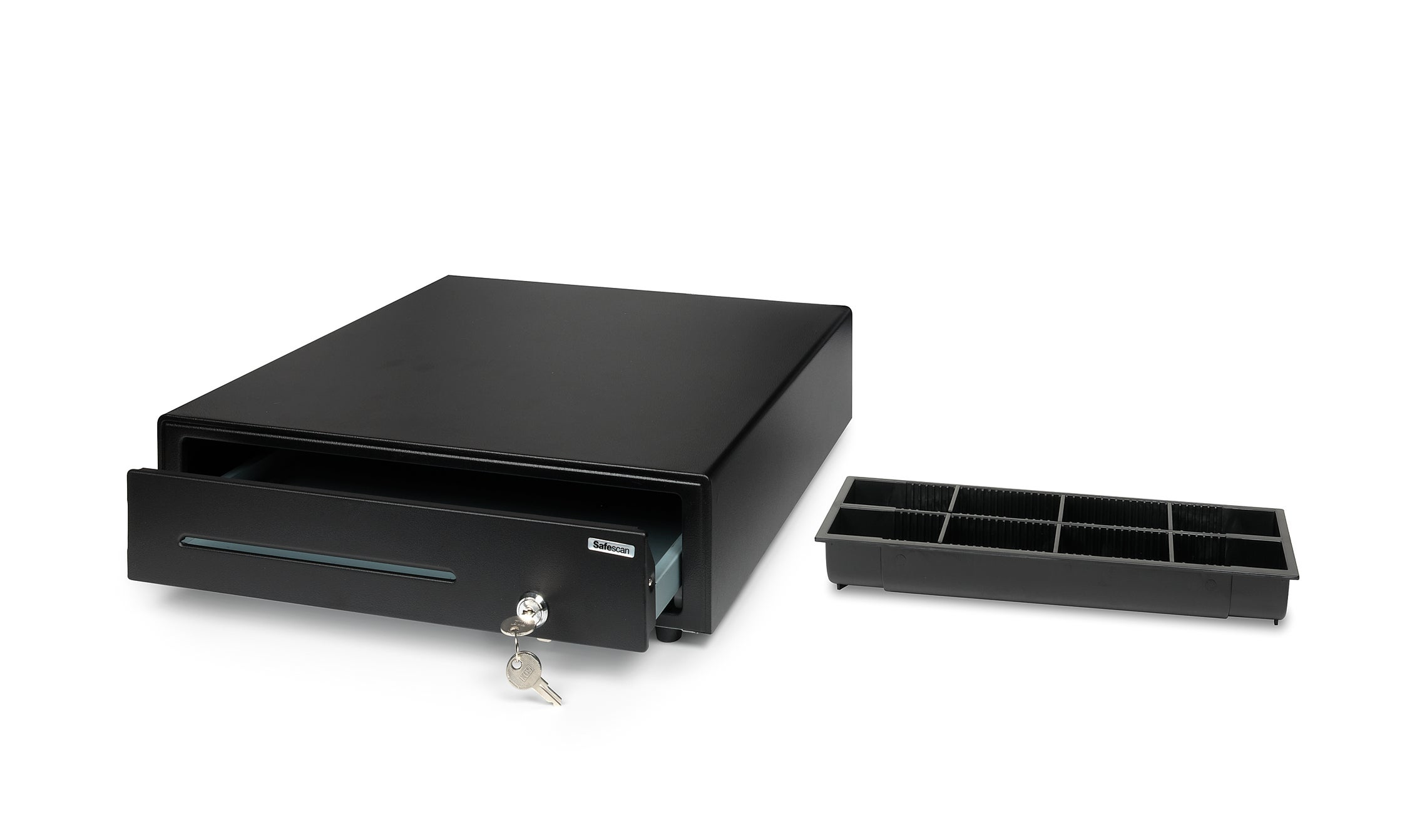 Tiroir caisse à 4 compartiments pour billets avec pinces et 8 compartiments pour pièces amovible.