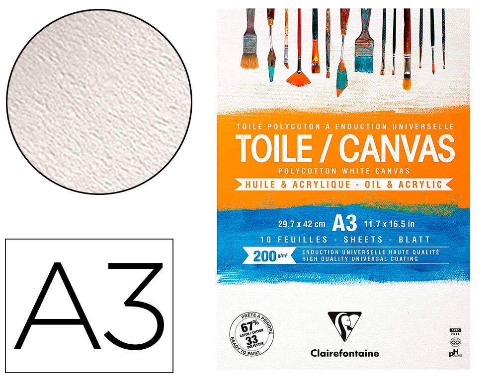 Toile blanche prête à peindre en polycoton (67% coton et 33% polyester). Tissu au grain moyen et régulier et à l'enduction universelle de qualité pour une meilleure accroche. Dédiée à la peinture à l'huile et à l'acrylique. Souple, elle se tend et se détend facilement selon le taux d'humidité. Sans acide, les couleurs sont préservées.