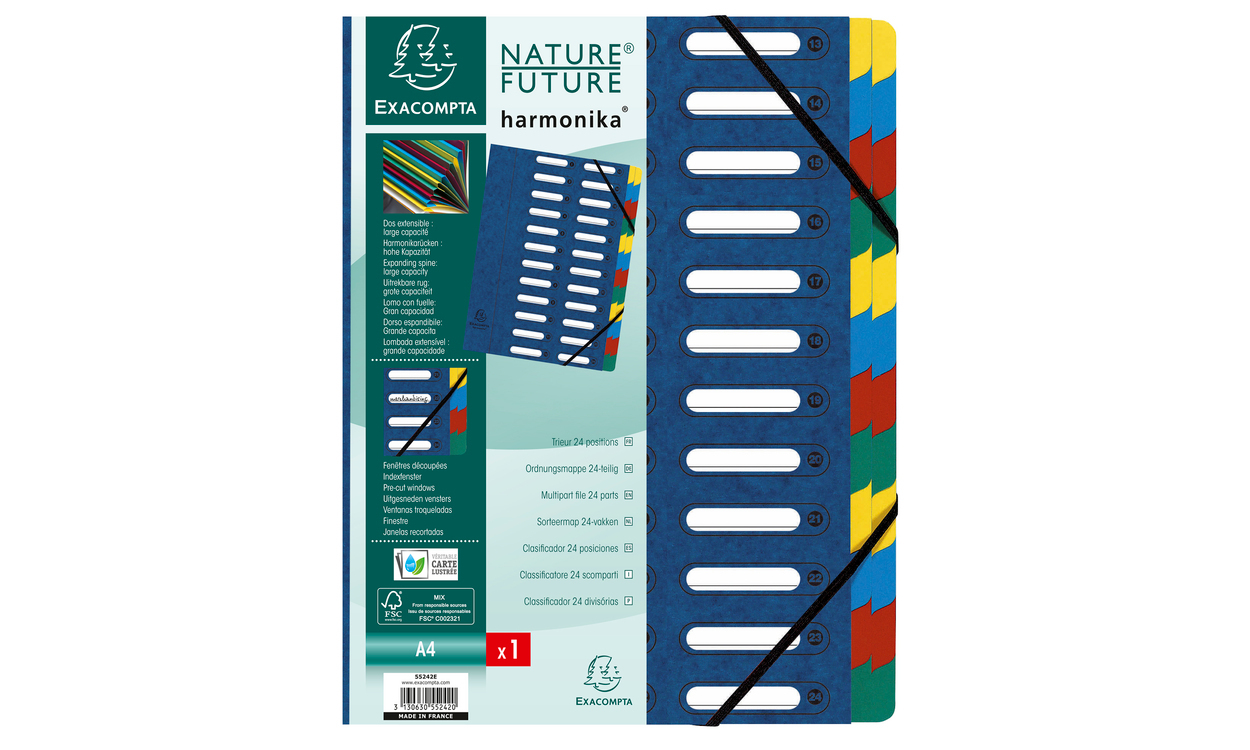 Trieur HARMONIKA® à fenêtres avec élastiques véritable carte lustrée 24 compartiments