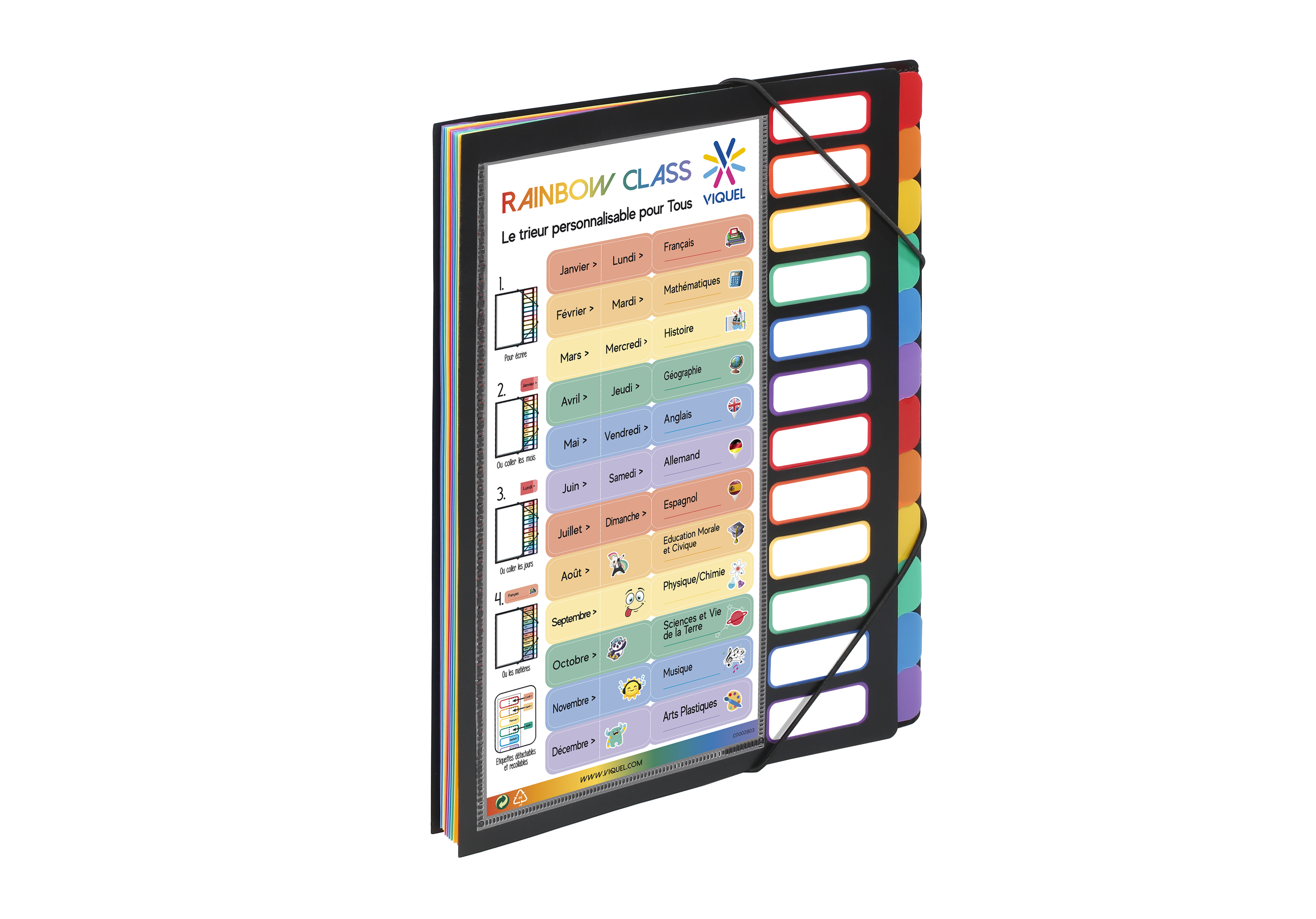 -Une planche de stickers en 1ère de couverture permettant de personnaliser le trieur pour classer ses documents en fonction des matières, des mois ou encore des jours de la semaine.