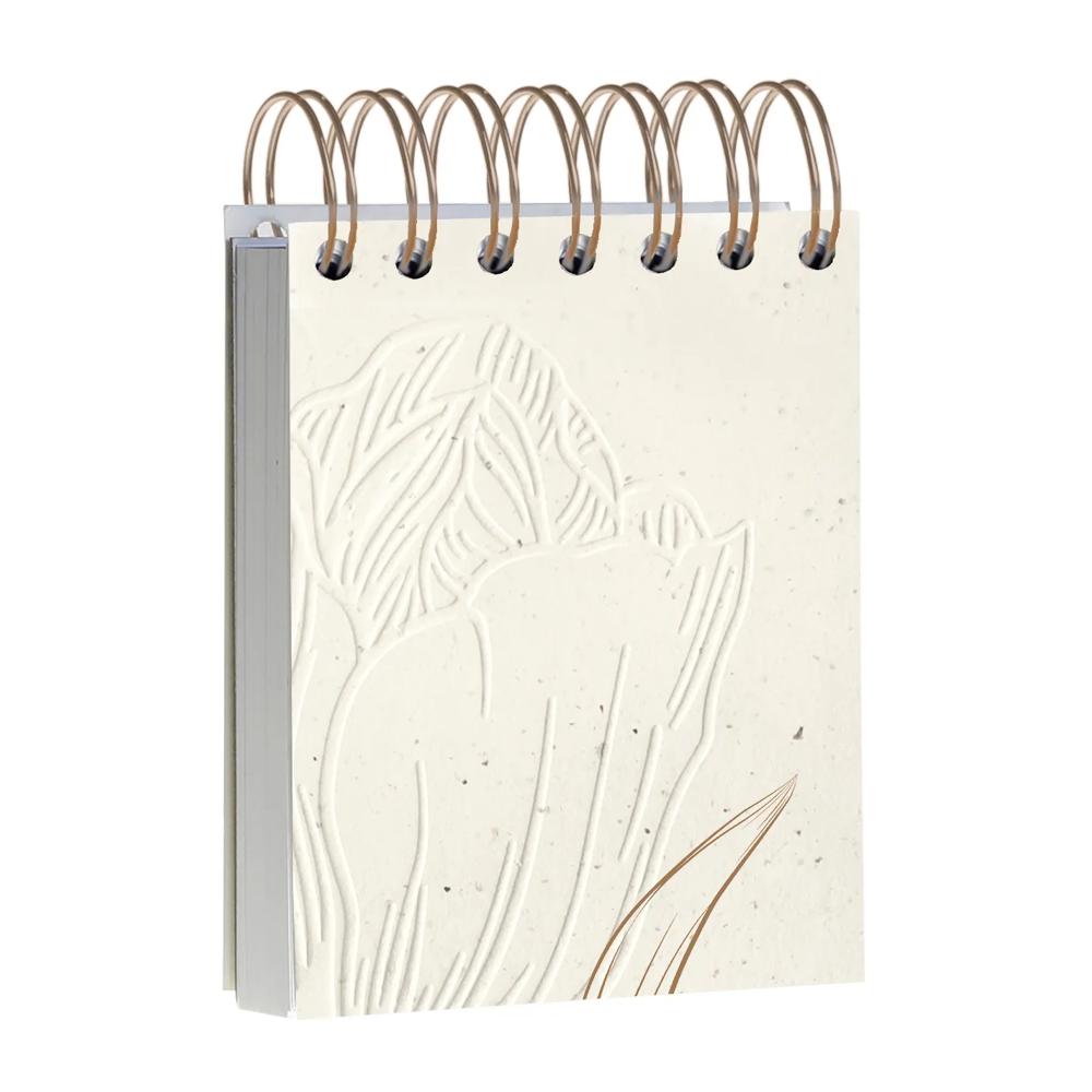 1 visuel. Couverture en papier parsemé d'éclats de bulbes de tulipe. Embossage. La qualité et la douceur du papier Clairefontaine vélin velouté ivoire 90g, certifié PEFC et fabriqué dans les Vosges par Clairefontaine.