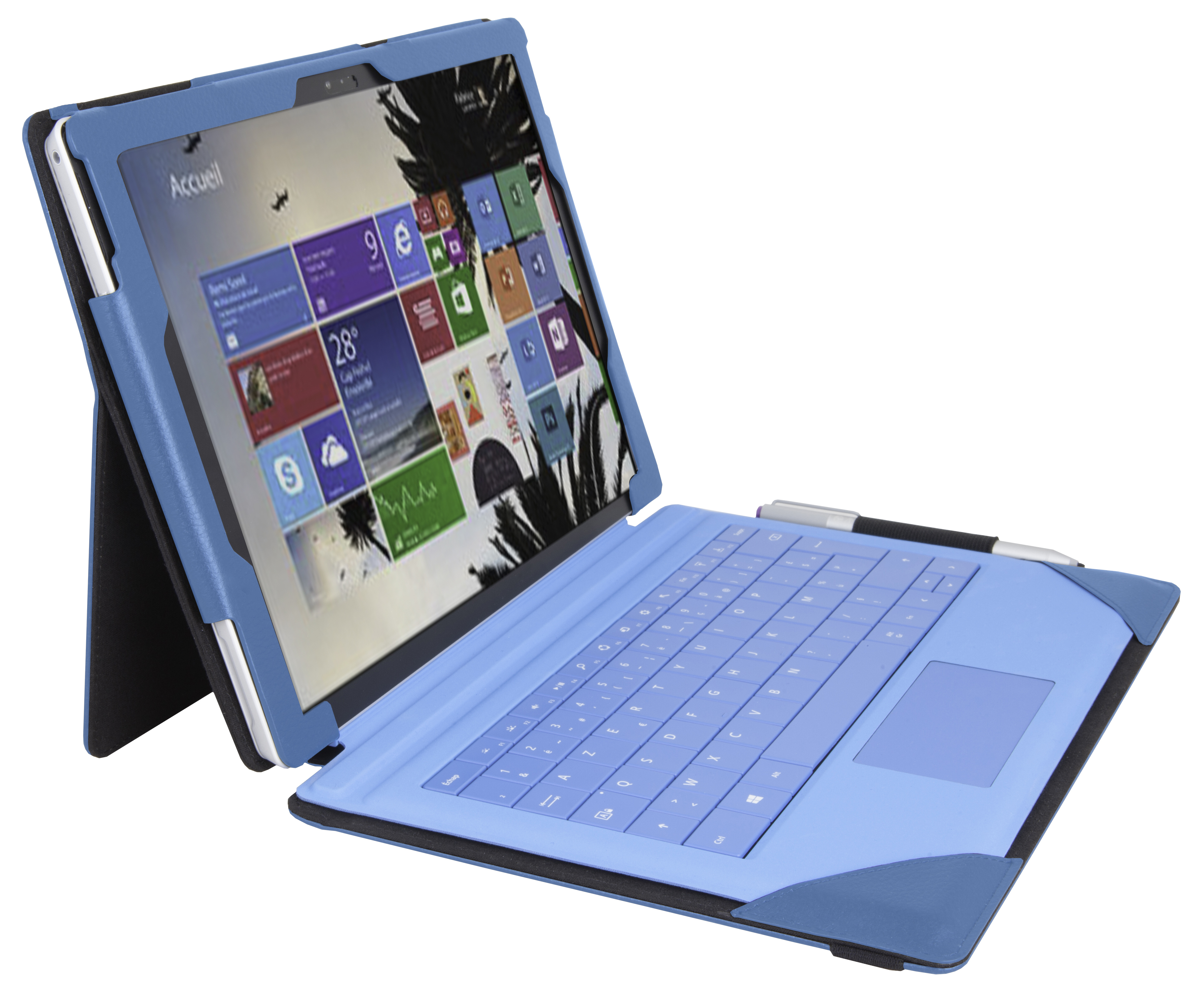 Folio sobre et chic en simili cuir qui protège la tablette Surface Pro 4 de Microsoft et son clavier ultra fin. Ouverture à l’arrière et à l’avant pour les appareils photo. Zone écran élargie pour une utilisation optimale des fonctionnalités de Windows 10. Fonction stand. Fermeture par bandeau élastique. Finition soignée (surpiqures). Matériau de qualité (simili cuir haut de gamme). Existe en noir, navy, rouge, turquoise et bleu-vert, les mêmes couleurs que les claviers Surface Pro 4.