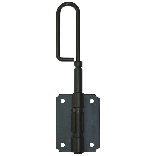 Le verrou baïonnette à visser diamètre 12 longueur 200 mm platine hauteur 80 mm largeur 60 mm épaisseur 1 mm avec 4 trous diamètre du vis 5 noir de chez Afbat verrouille les battants d'un portail en bois.