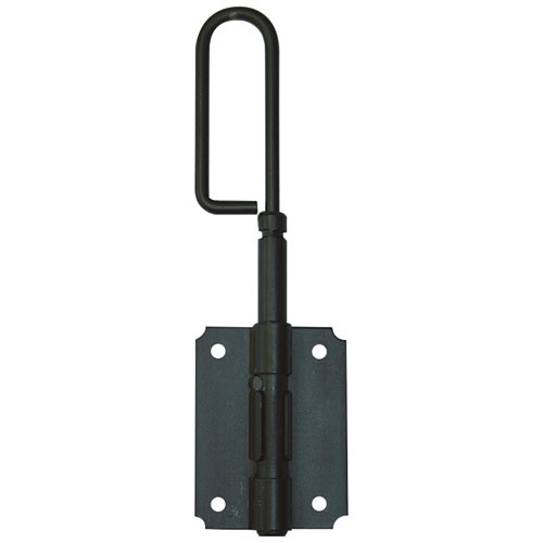 Le verrou baïonnette à visser diamètre 14 longueur 305 mm platine hauteur 90 mm largeur 66 mm épaisseur 1 mm avec 6 trous diamètre du vis 5 noir de chez Afbat verrouille les battants d'un portail en bois.