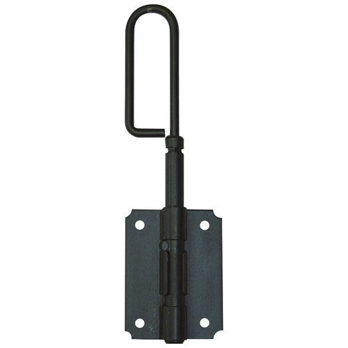 Le verrou baïonnette à visser diamètre 14 longueur 398 mm platine hauteur 90 mm largeur 66 mm épaisseur 1 mm avec 4 trous diamètre du vis 5 noir de chez Afbat verrouille les battants d'un portail en bois.