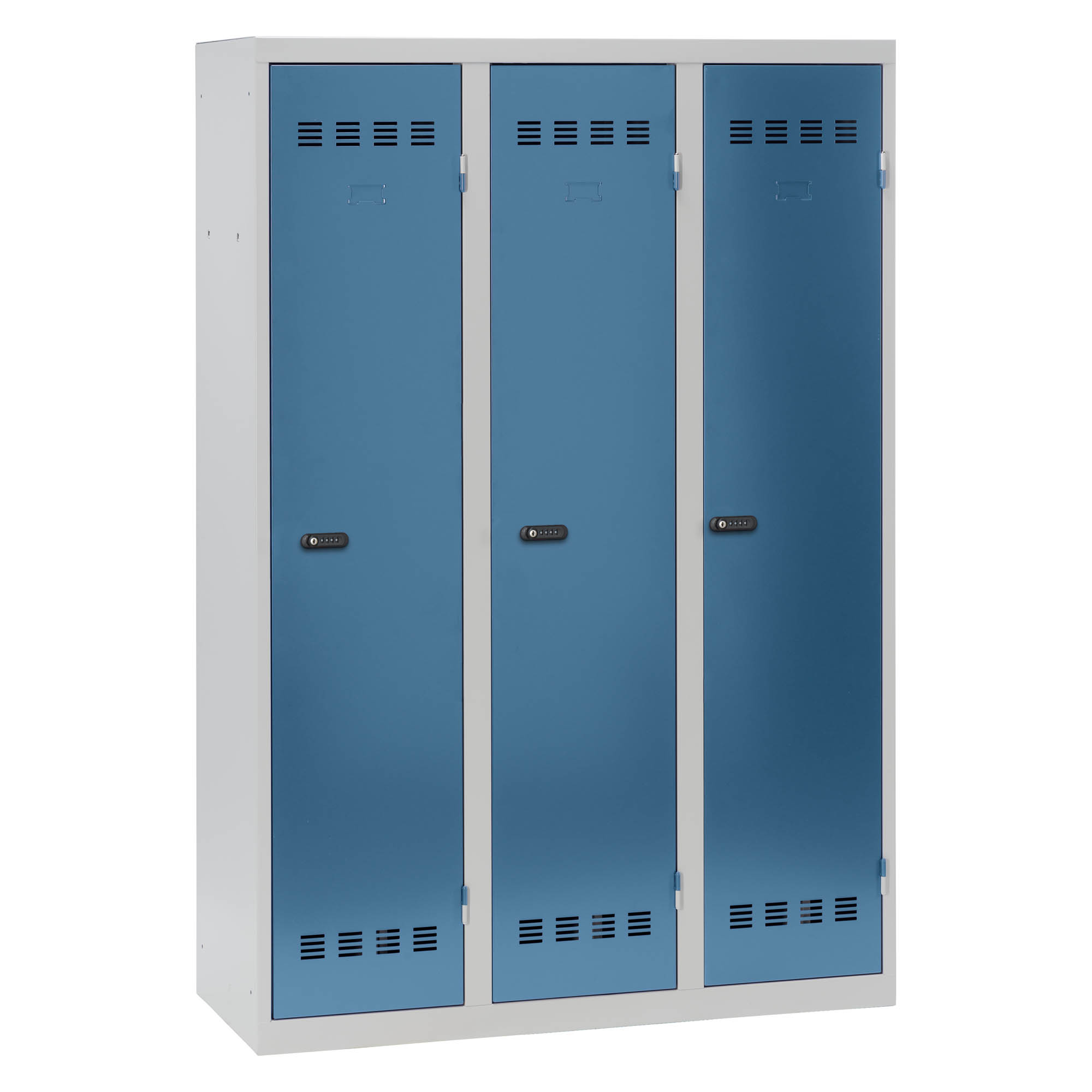 Equipement : tablette dans le coloris du corps du vestiaire. Cloison médiane sous la tablette avec tube support cintre et deux patères supportant jusqu’à 30 kg. Miroir fourni 12 x 8 cm avec fixation adhésive sur la porte.