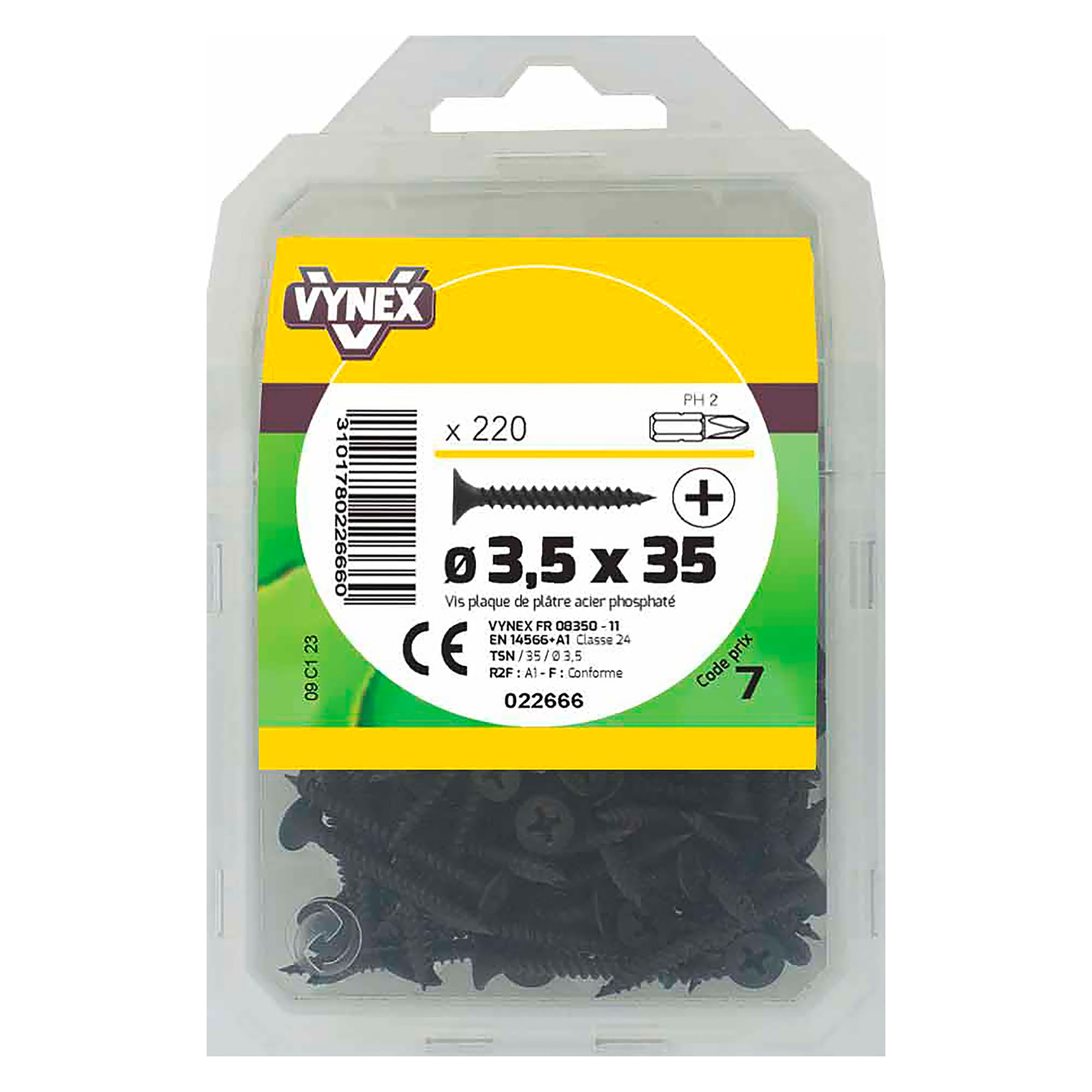 Vis plaque de plâtre en acier phosphaté Ø 3,5 x L 35 mm. Tête trompette cruciforme pour un encastrement précis et une finition soignée. Pointe effilée pour une pénétration immédiate sans pré-perçage. Convient au vissage manuel ou à la visseuse électrique. Idéale pour cloisons, plafonds et habillages muraux. Paquet de 220 vis.